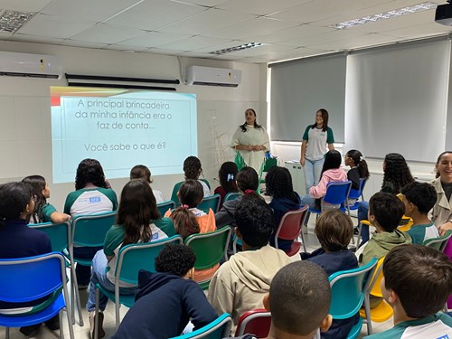 A convidada especial do encontro foi a diretora da unidade, Tathiana Brito, que também é mãe da aluna Maria Eduarda, do 9º ano. Durante a conversa, Tathiana compartilhou com os alunos as brincadeiras que marcaram sua infância, além de comentar sobre os momentos lúdicos que ainda vive hoje ao lado da filha. Duda também participou, contando quais são as brincadeiras que ela mais gosta e como é possível se divertir longe das telas e tecnologias.