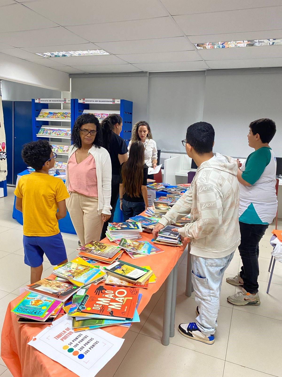A atividade contou com a participação de alunos, pais, responsáveis e funcionários, que trouxeram livros já lidos e puderam escolher novas leituras para levar para casa. Um destaque especial foi a colaboração dos alunos do 7º ano A, que atuaram como mediadores da atividade, auxiliando as famílias na escolha dos títulos e orientando todo o processo de troca.